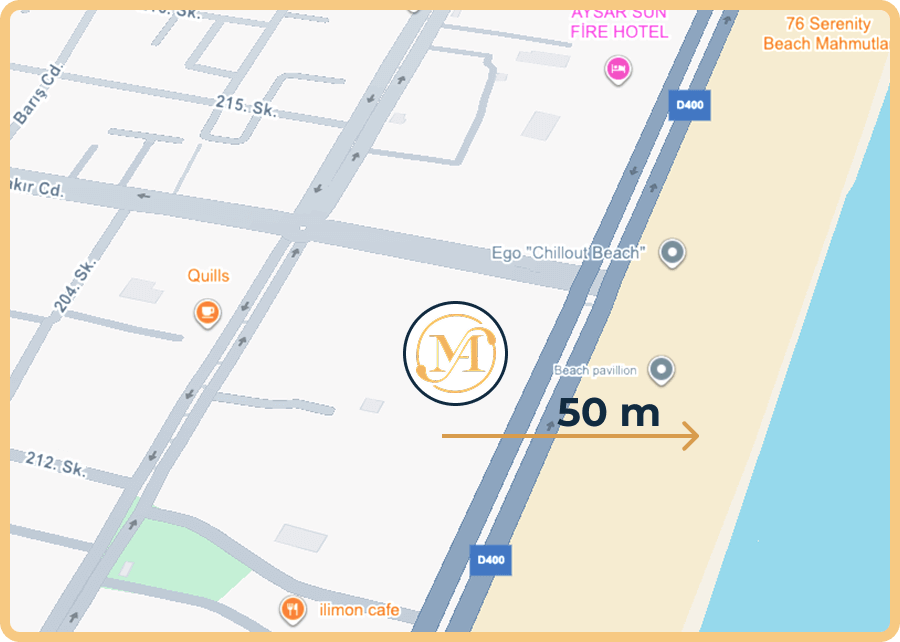 Мы расположены на первой береговой линии, в одном из самых уютных районов Аланьи — Махмутларе. Здесь море встречает вас в нескольких шагах, а вокруг — рестораны, кафе и уютные торговые улочки с местным колоритом.